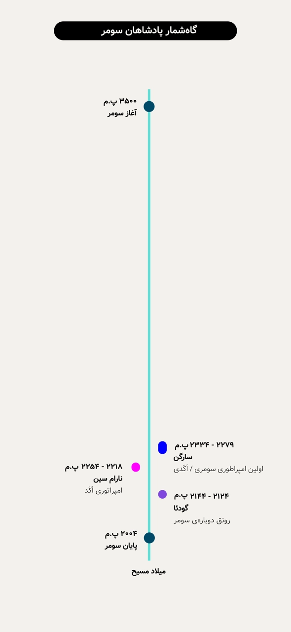 در جنوب میانرودان، تمدنهای سومر و اکد همزمان حضور داشتند و در کنار هم رشد کردند. سومریها بیشتر در شهرهای کهن جنوب میزیستند و اکدیها، که زبانشان سامی بود، در همان فضا بهتدریج به قدرت سیاسی دست یافتند. آنچه رخ داد پایان سومر نبود، بلکه برتری سیاسی اکد بر بسیاری از شهرهای سومری بود.